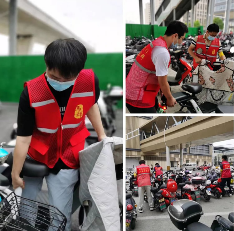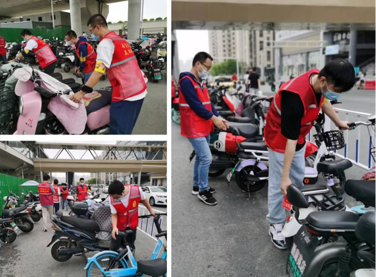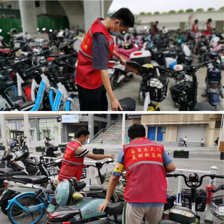 另一邊,元帥班和初心班的男干部也不甘示弱。面對停放雜亂的電動車,他們互相配合,合作整理,并引導(dǎo)正在停車的車主有序停放。原本略顯雜亂的停車區(qū)很快變得井井有條起來。