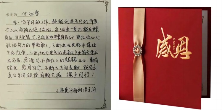 感謝卡:每一份平凡的工作,都能創(chuàng)造不凡的價(jià)值,你加入海陵已經(jīng)3年啦,這3年來一直扎根在包裝崗位,歲月更替,你已成長為包裝崗位的“崗位放心人”。積極努力地帶教新人,不斷地在實(shí)踐中保證產(chǎn)品質(zhì)量,不斷地為更多的患者生產(chǎn)出符合要求的藥品。感謝你在崗位上的兢兢業(yè)業(yè),勤奮踏實(shí),感恩有你,不斷為車間貢獻(xiàn),期待未來與車間繼續(xù)同頻共振,攜手同行!