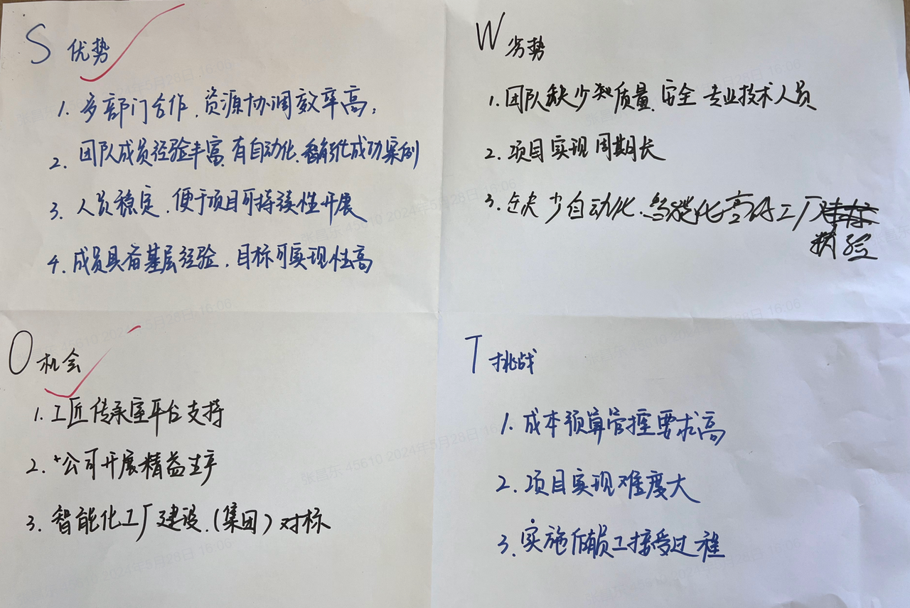 5月28日,海陵8個(gè)工匠傳承室參與了2024-2025年度的行動(dòng)學(xué)習(xí)共創(chuàng)會(huì),各自明確了本傳承室新一年度目標(biāo),碰撞出思維火花,共創(chuàng)分解指標(biāo)。其中王志鵬傳承室深知,在快速變化的工業(yè)4.0時(shí)代,自動(dòng)化與智能化是提升生產(chǎn)效率、保證產(chǎn)品質(zhì)量的關(guān)鍵。因此,他們將目光聚焦于未來,確立了打造自動(dòng)化智能車間的愿景。這一愿景不僅承載著對(duì)技術(shù)進(jìn)步的追求,更蘊(yùn)含著對(duì)工匠精神的傳承與創(chuàng)新?;谠妇埃踔均i傳承室設(shè)置了三個(gè)關(guān)鍵目標(biāo),進(jìn)行了SWOT分析與策略制定。