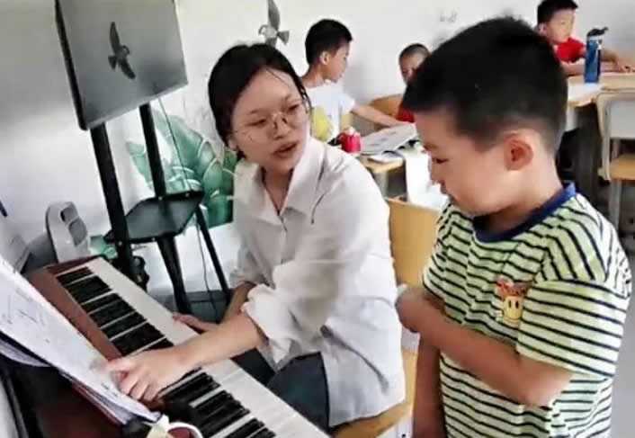 接下來,小朋友們迫不及待地展示自己在暑托班期間的學習成果。首先是音樂課的學習成果,大家在老師的帶領(lǐng)下進行兒歌《快樂的小跳蛙》的合唱。