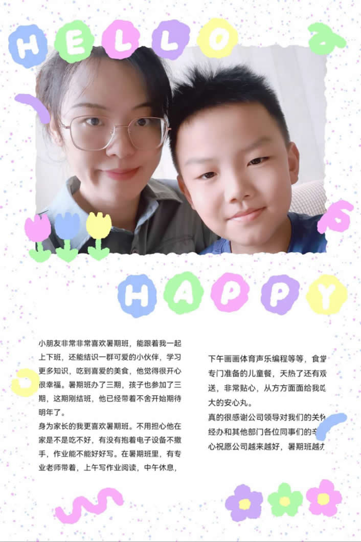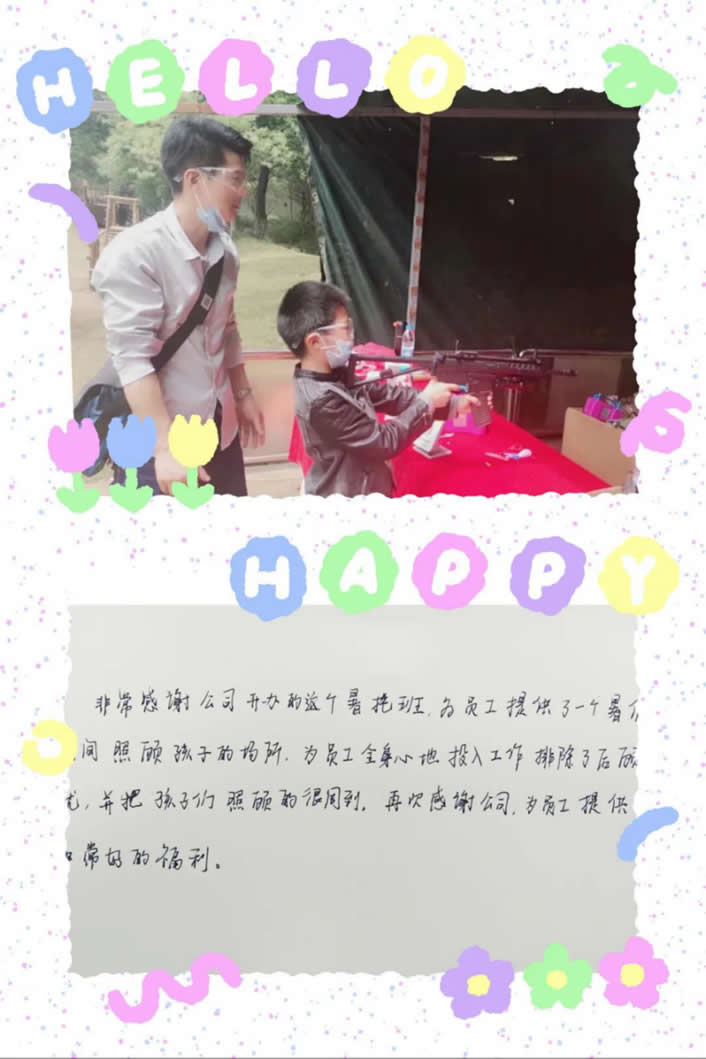 非常感謝公司開辦的這個暑托班,為員工提供了一個暑假期間照顧孩子的場所,為員工全身心地投入工作排除了后顧之憂,并把孩子們照顧的很周到,再次感謝公司,為員工提供了非常好的福利。