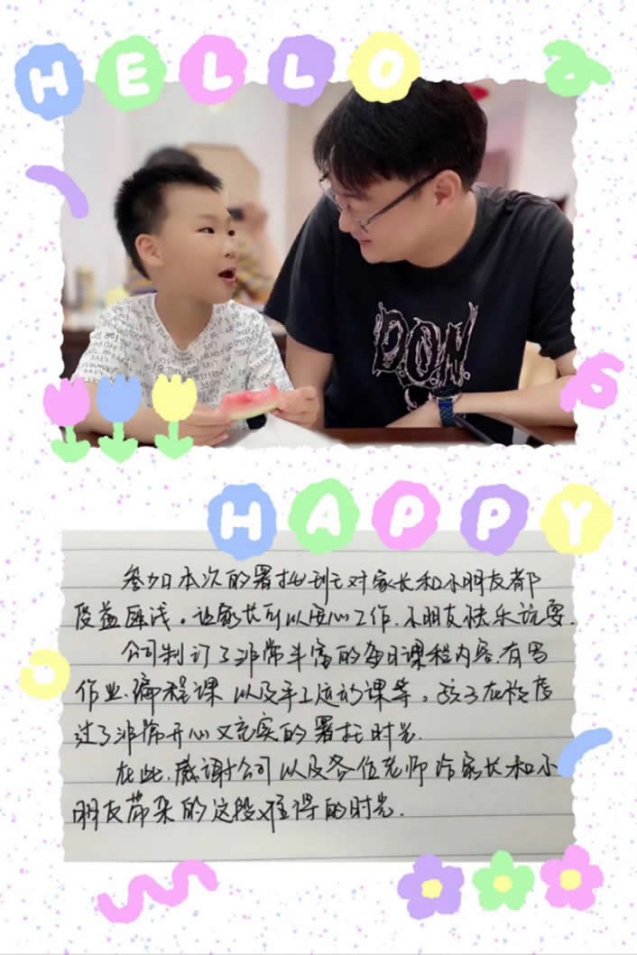 參加本次的暑托班對家長和小朋友都受益匪淺,讓家長可以安心工作,小朋友快樂玩耍。公司制訂了非常豐富的每日課程內(nèi)容,有寫作業(yè)、編程課以及手工運動課等。孩子在校度過了非常開心又充實的暑托時光。在此,感謝公司以及各位老師給家長和小朋友帶來的這段難得的時光。