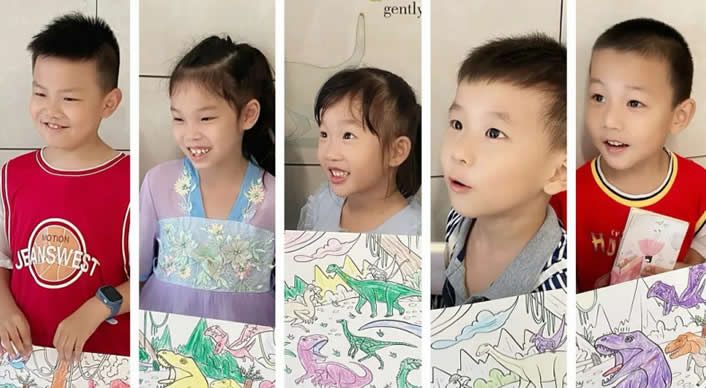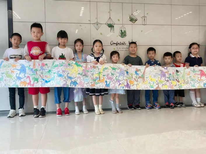 暑托班期間孩子們齊心協(xié)力,合作完成了一幅繪卷《恐龍世界》~在結(jié)營儀式上,孩子們展開長卷,共同展示自己的成果,分享自己的感受。