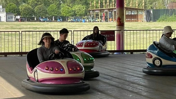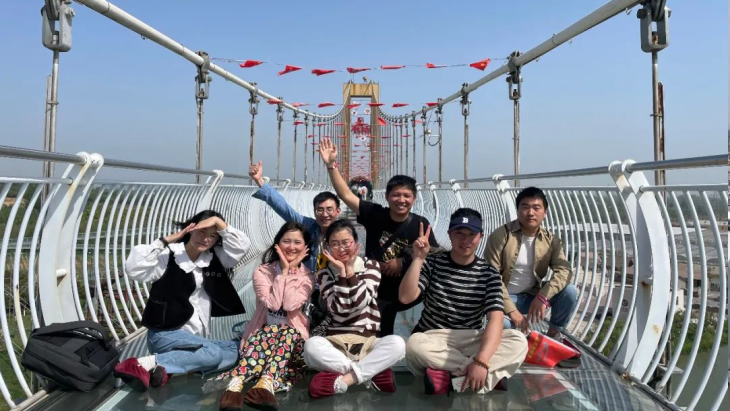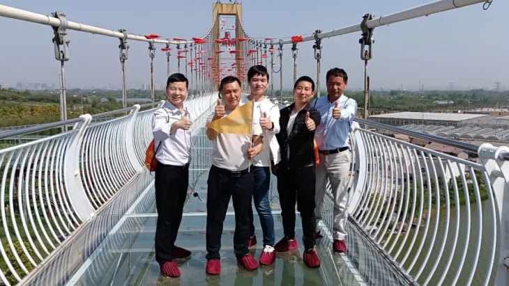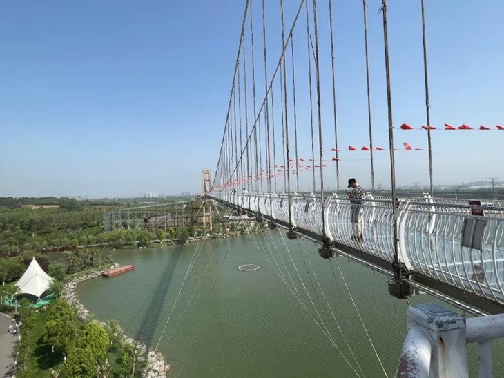 午后升溫的烈日下,完成競(jìng)賽的成員三五成群的來到游樂設(shè)施區(qū)域。最火爆的項(xiàng)目非“鵲橋”——高空玻璃棧道莫屬。
