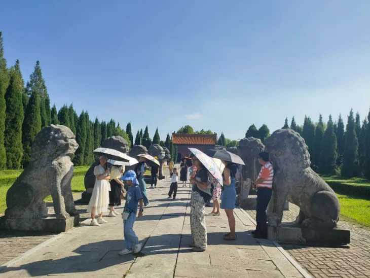 中午,大家在農(nóng)家樂品嘗了當(dāng)?shù)靥厣↓埼r,隨后坐車前往第二站明祖陵。這里被譽為全國唯一一座水下皇陵,承載了朱明興衰的塵煙。工匠與家屬們漫步在陵墓神道之上,在講解聲中觀察幾百年前的石刻群像,體會其中的歷史余韻與時代遺音。石像歷經(jīng)幾百年時光仍然細(xì)節(jié)豐富、栩栩如生,然而六朝舊事隨流水,百年帝業(yè)亦成空。